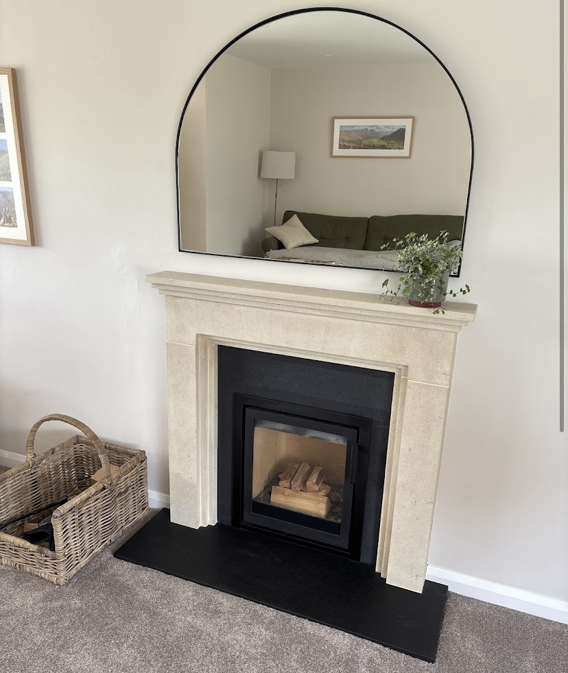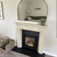 Beautiful hand carved stone surround classic stepped design carved from solid blocks of English natural Bath stone complete a 3 piece Bath stone back panel.